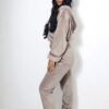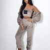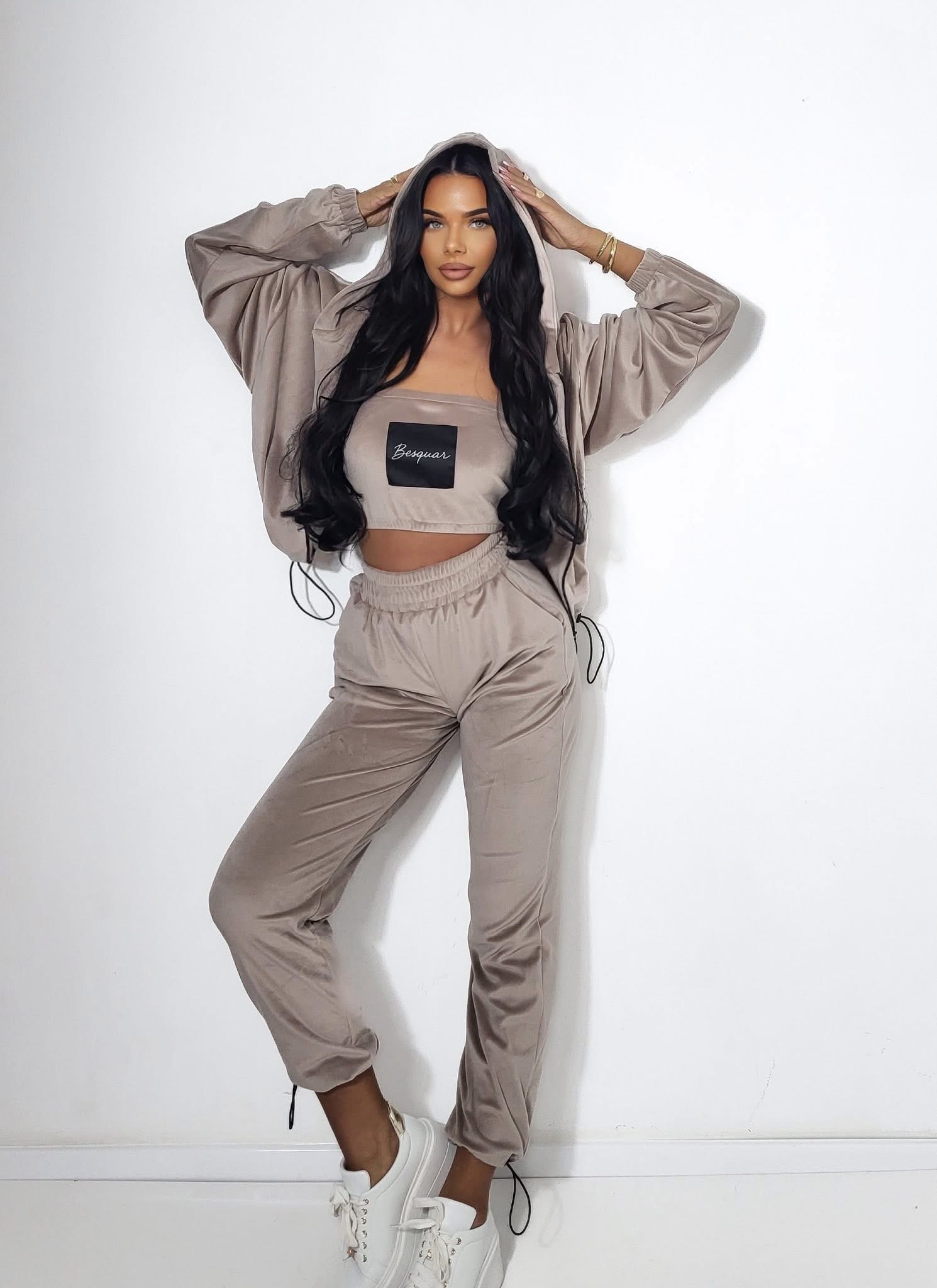 Ten trzyczęściowy dres welurowy to totalny hit, który daje Ci mnóstwo możliwości stylizacji i niesamowitą wygodę. Miękki, lśniący materiał sprawia, że cały zestaw prezentuje się bardzo luksusowo i jest wyjątkowo przyjemny dla skóry. W komplecie znajdziesz luźną bluzę z kapturem, dopasowany top oraz spodnie na wygodnej gumie w pasie, które mają nogawki zakończone praktycznymi ściągaczami.