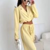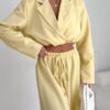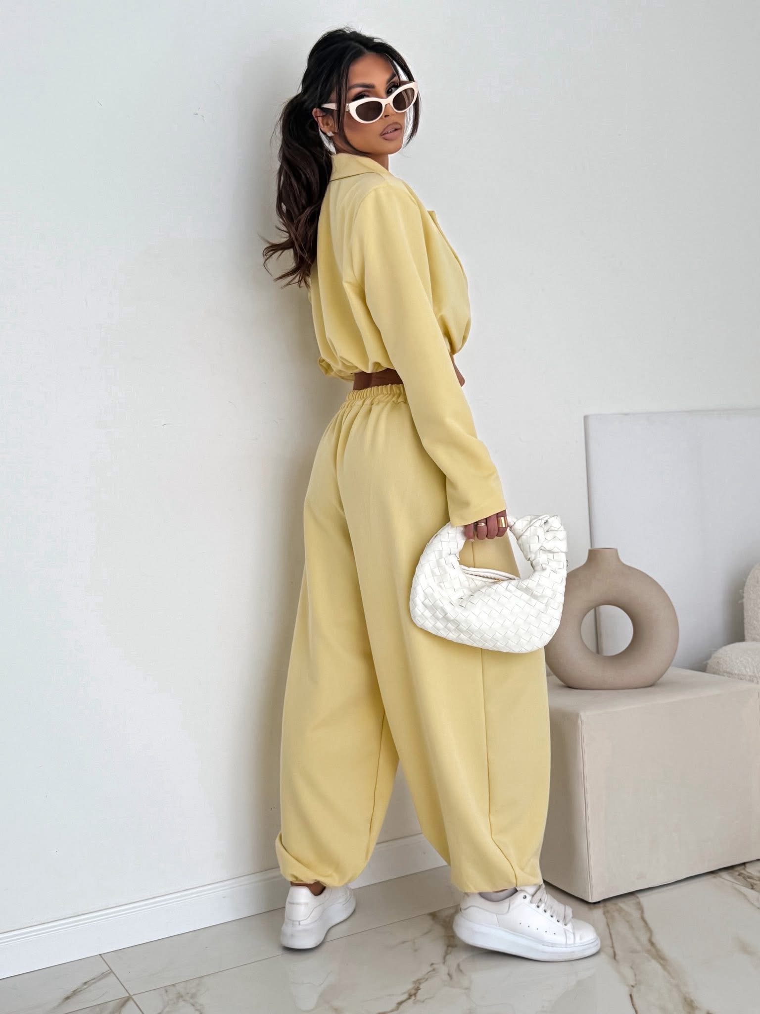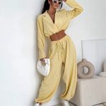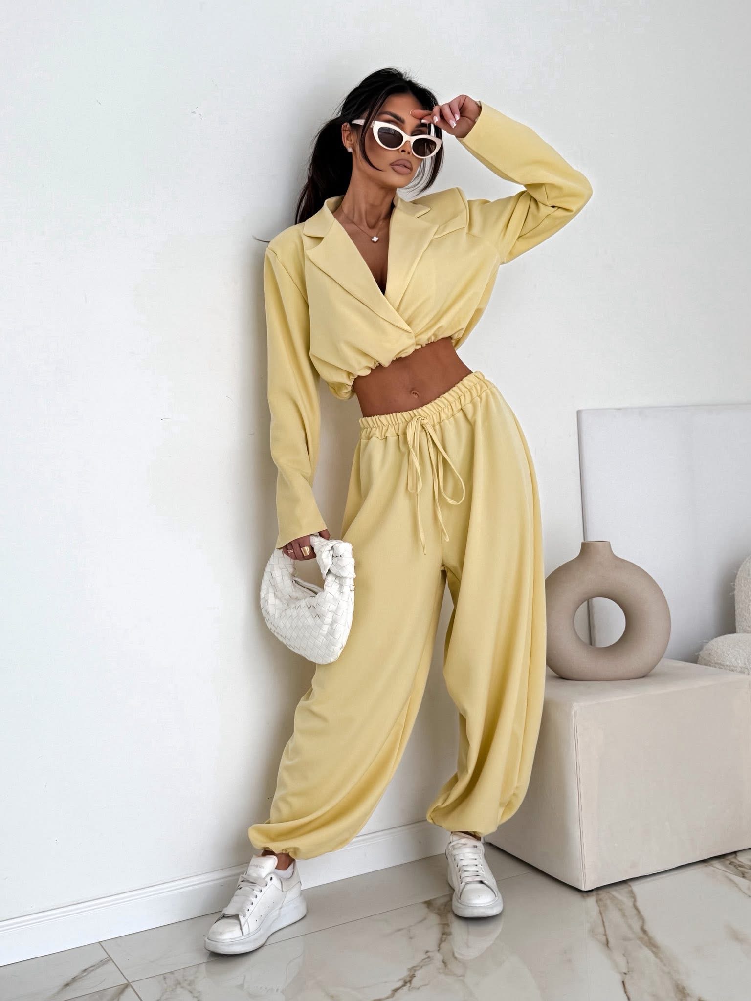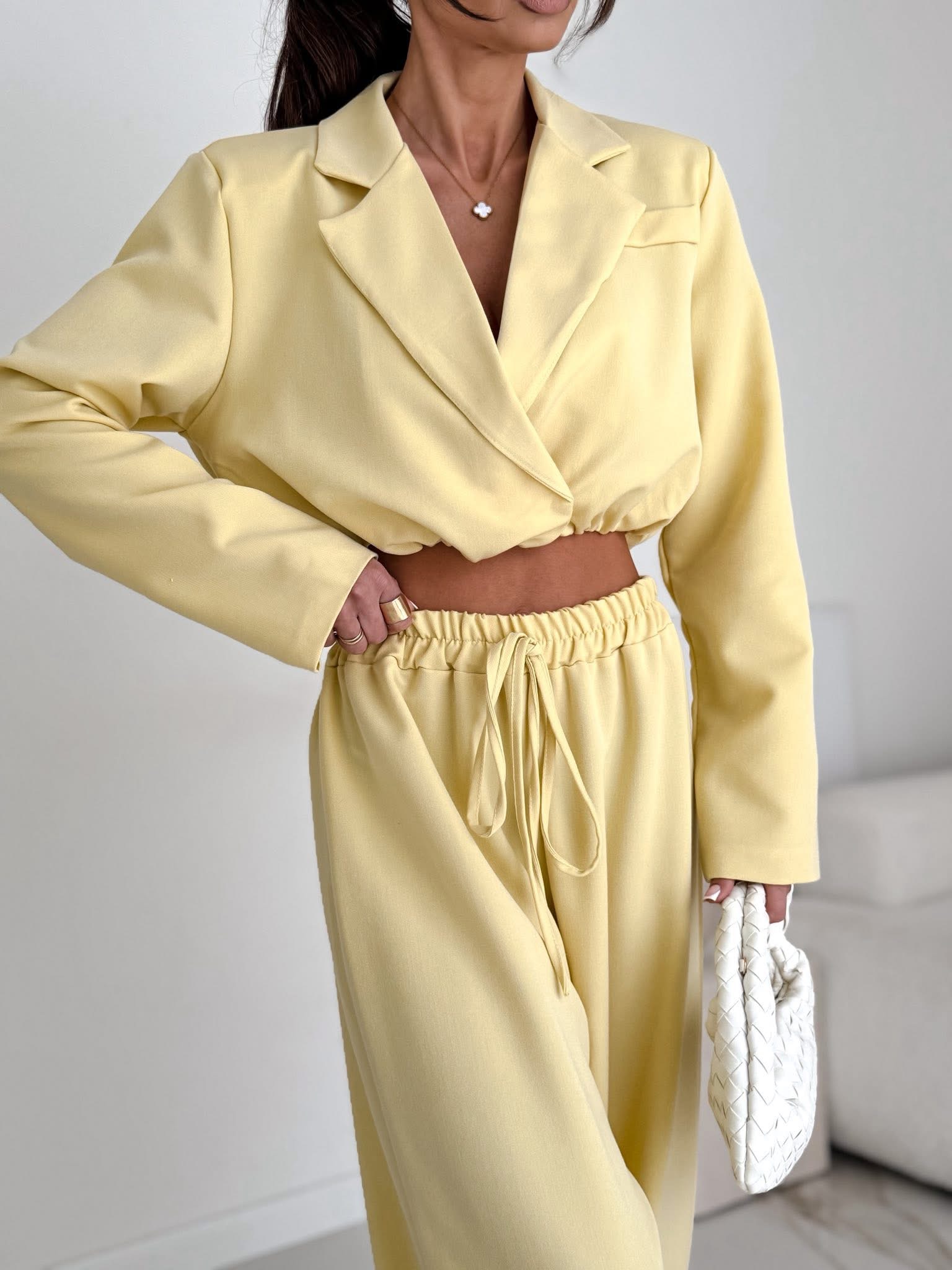 Elegancki komplet w modnym wydaniu. Krótka marynarka z kołnierzem pięknie podkreśla talię, a spodnie z gumką i wiązaniem zapewniają wygodne dopasowanie. Luźny krój sprawia, że komplet jest idealny na co dzień, wyjścia oraz wakacyjne stylizacje.