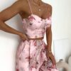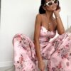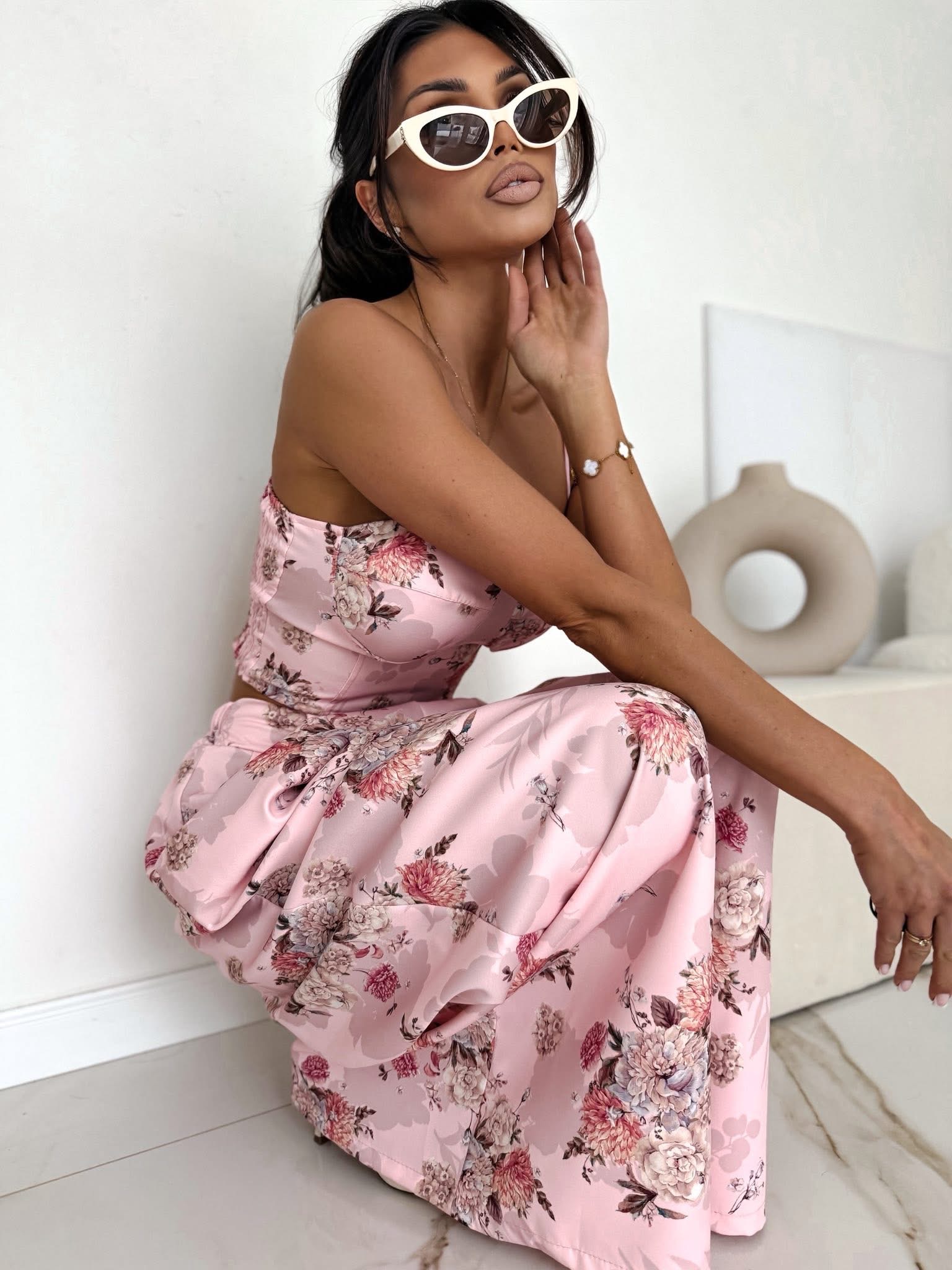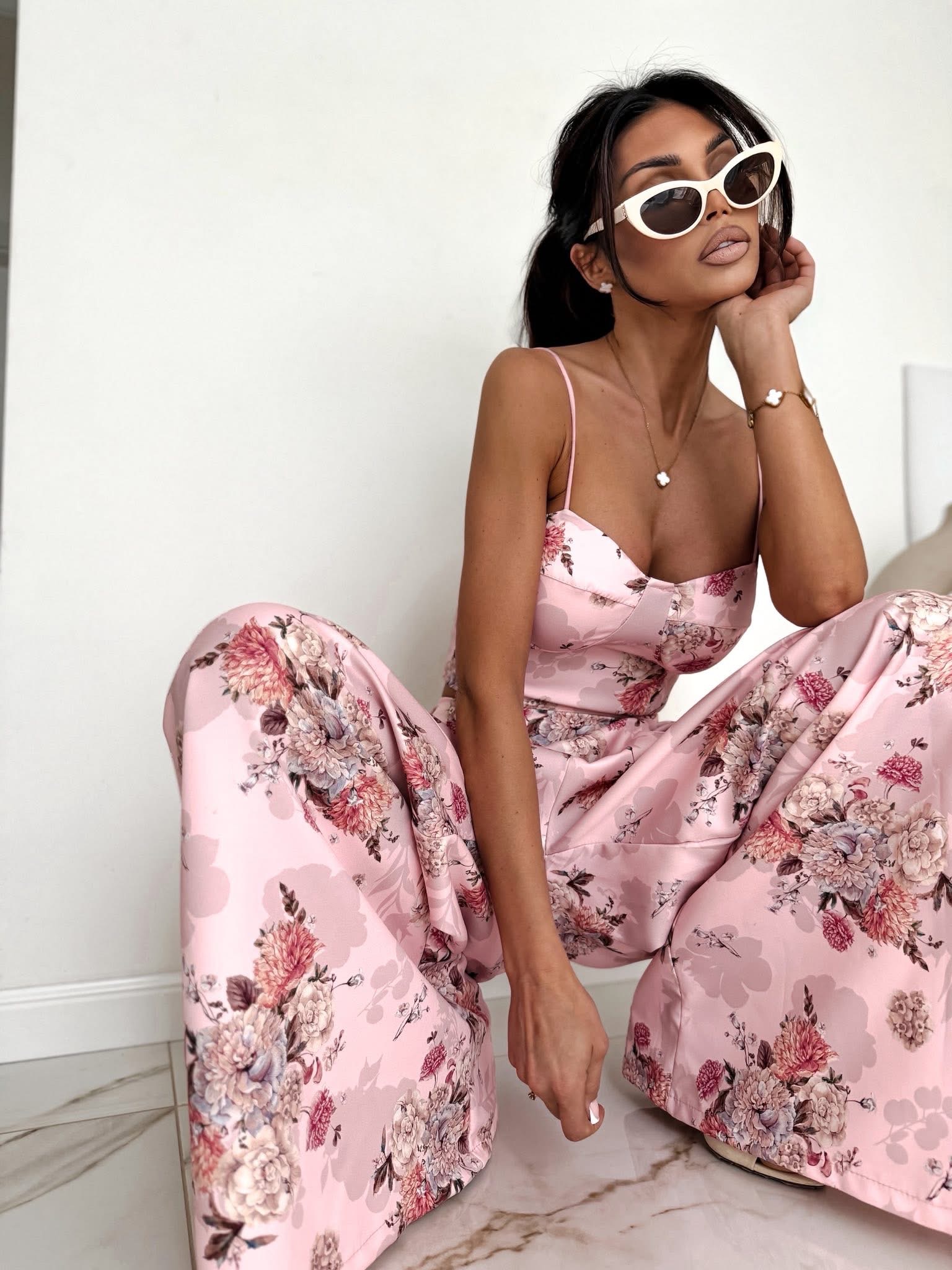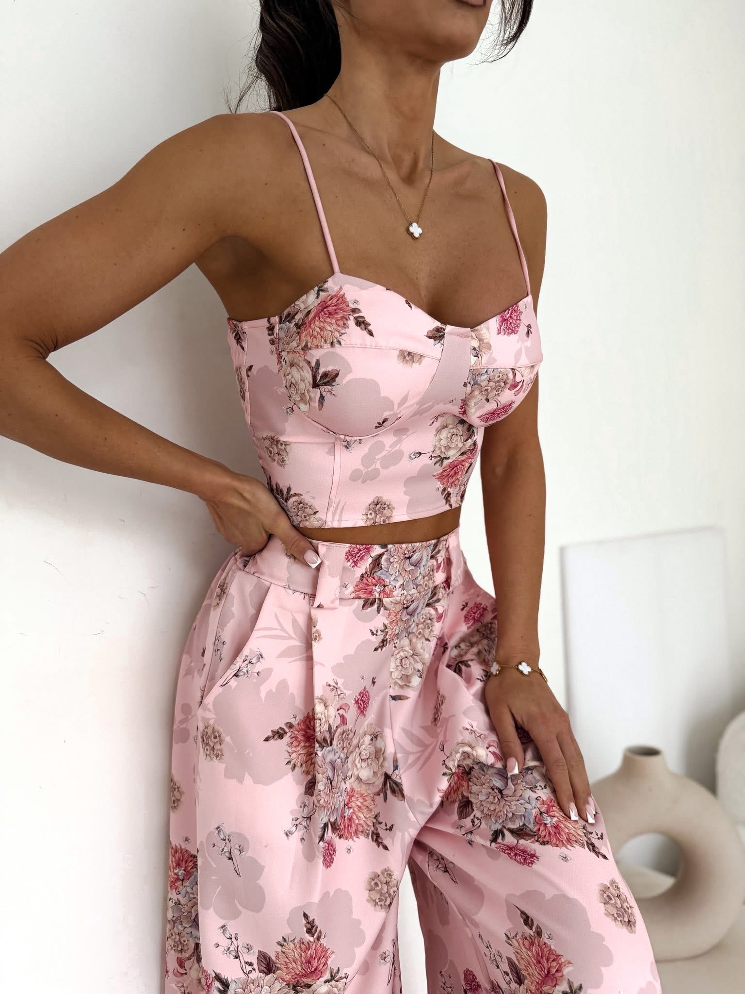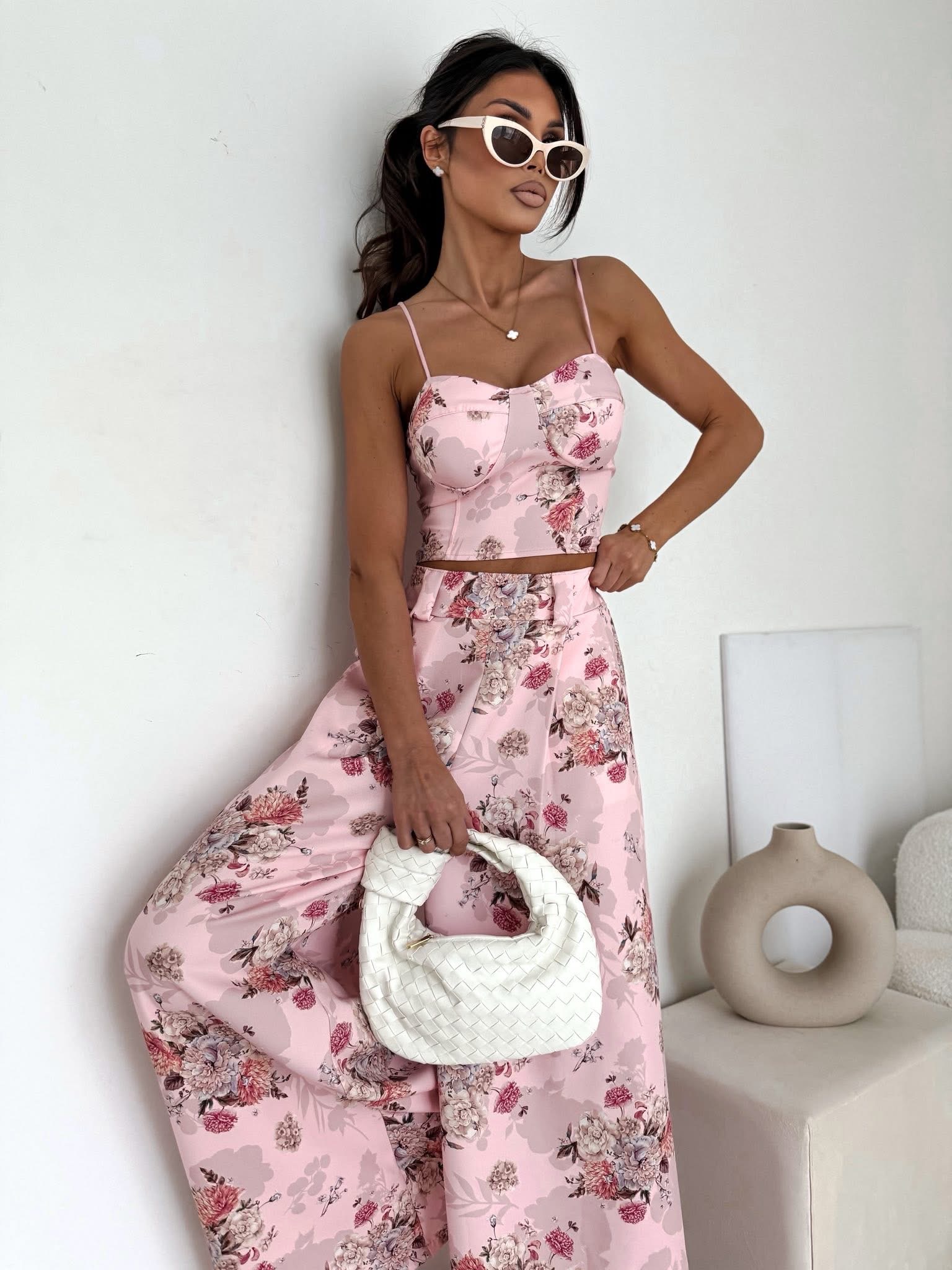 Stylowy komplet w kwiaty składający się z topu na ramiączkach z usztywnianymi miseczkami oraz spodni z szeroką nogawką. Model idealnie podkreśla talię i sylwetkę, a lekki materiał sprawia, że komplet świetnie sprawdzi się w cieplejsze dni. Doskonały wybór na eleganckie i codzienne stylizacje.