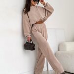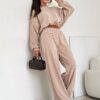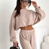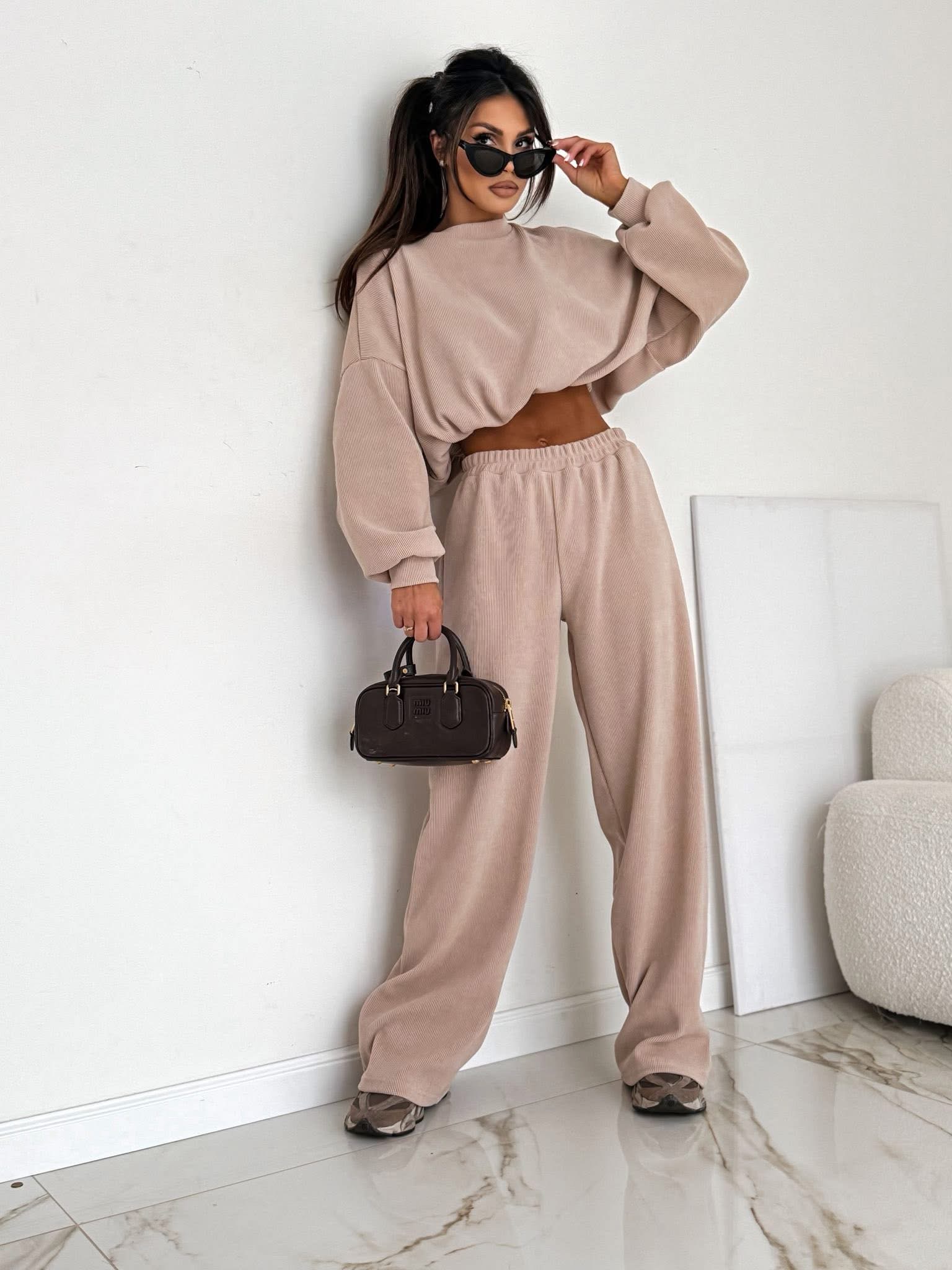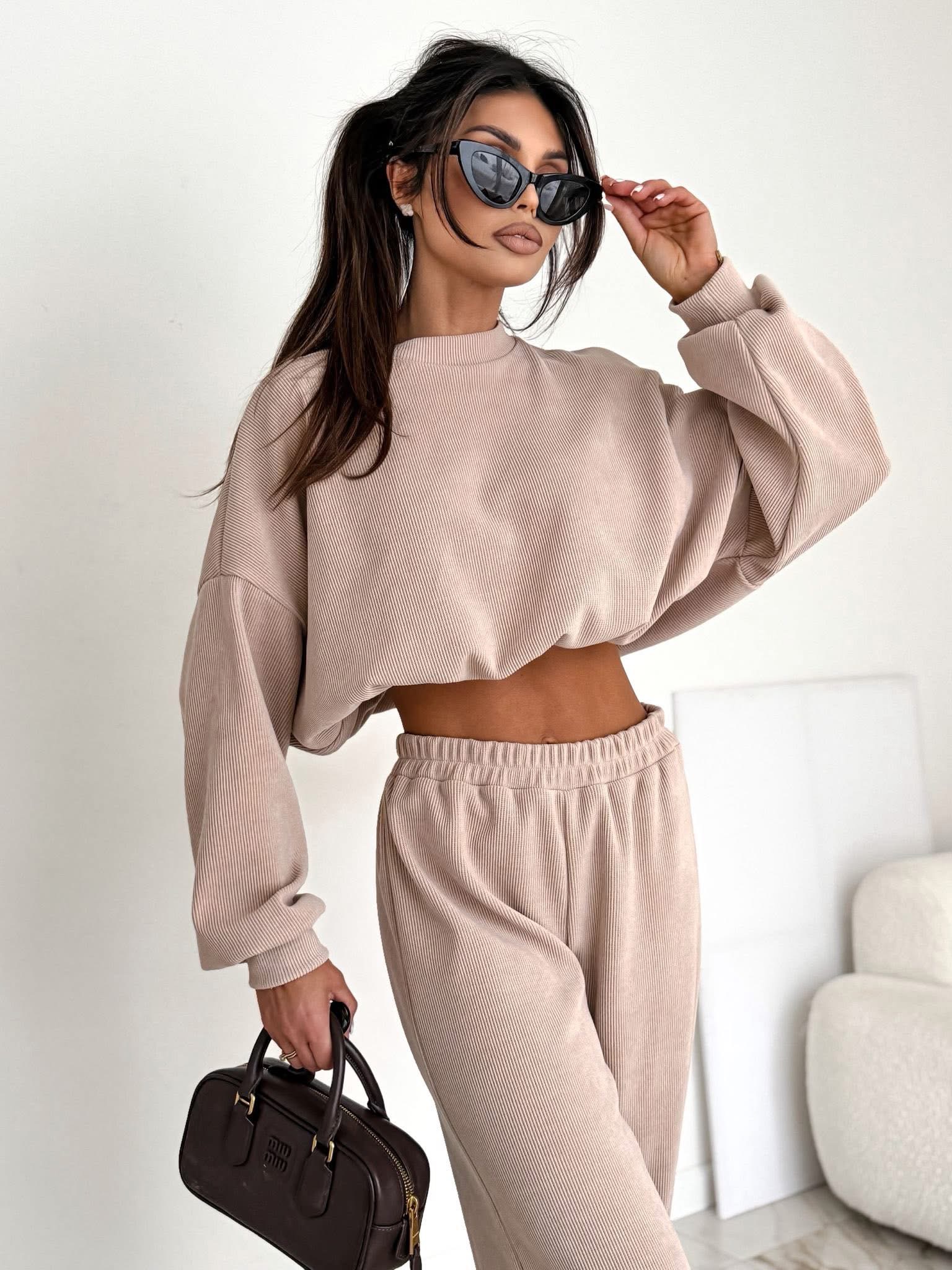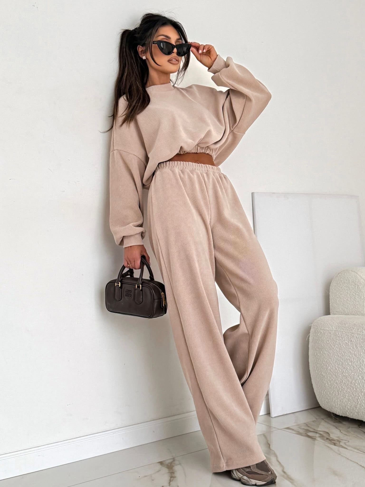 Stylowy komplet wykonany z miękkiego, bawełnianego sztruksu. Bluza o luźnym kroju z obniżoną linią ramion pięknie układa się na sylwetce, a spodnie z elastyczną gumką w pasie gwarantują wygodę i swobodę ruchów. Idealny wybór na codzienne stylizacje w modnym, minimalistycznym wydaniu.