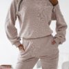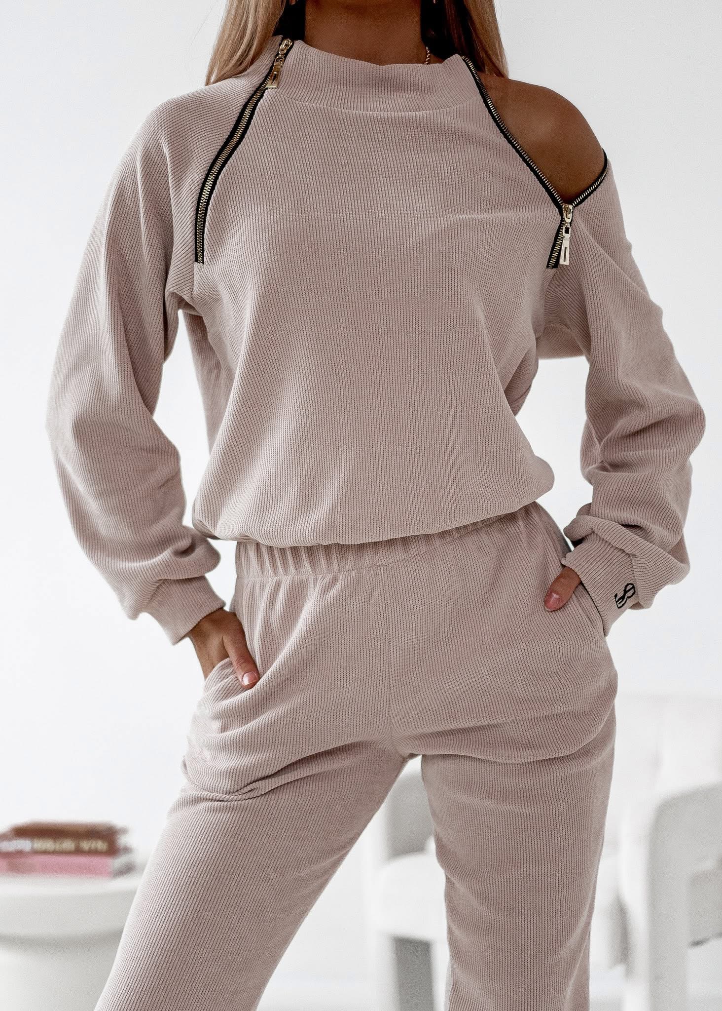 Odkryj komplet TOKYO rodzimej produkcji, który łączy wyjątkową strukturę miękkiego sztruksu oraz nowoczesny krój idealny dla wymagających kobiet. Zestaw składa się z bluzy ze stójką ozdobionej eleganckimi złotymi zamkami oraz spodni z praktycznymi kieszeniami i nogawkami zakończonymi ściągaczem. Dzięki wbudowanemu troczkowi z łatwością wyregulujesz długość i szerokość góry, co pozwala na perfekcyjne dopasowanie całości do Twojej sylwetki. To propozycja łącząca 80% bawełny oraz elastyczność materiału, która gwarantuje pełną swobodę ruchów.