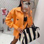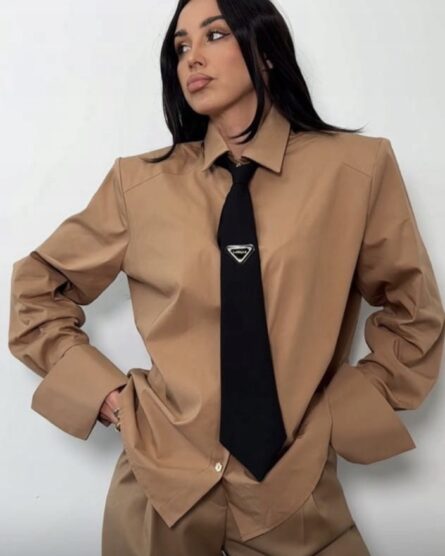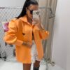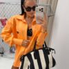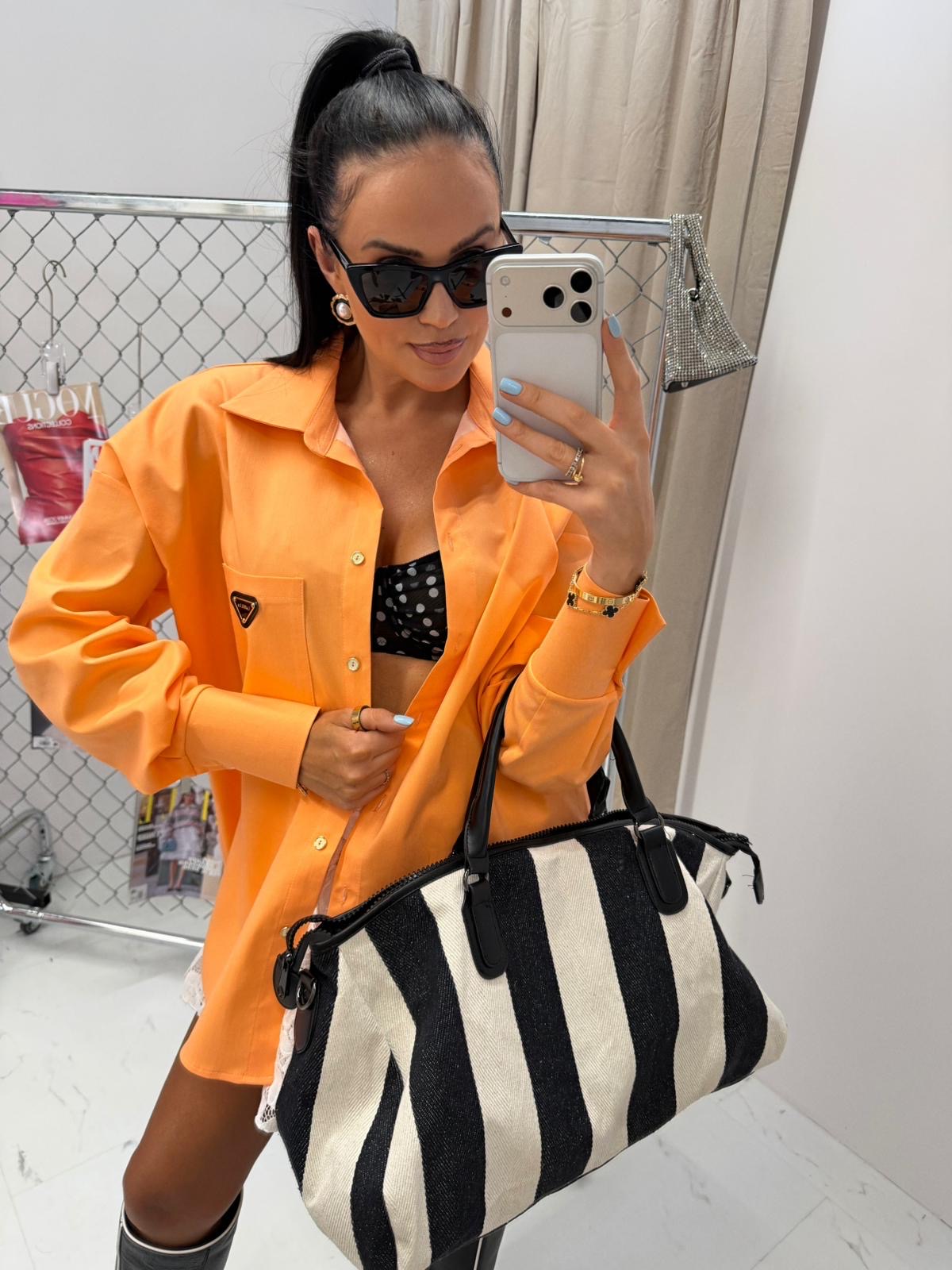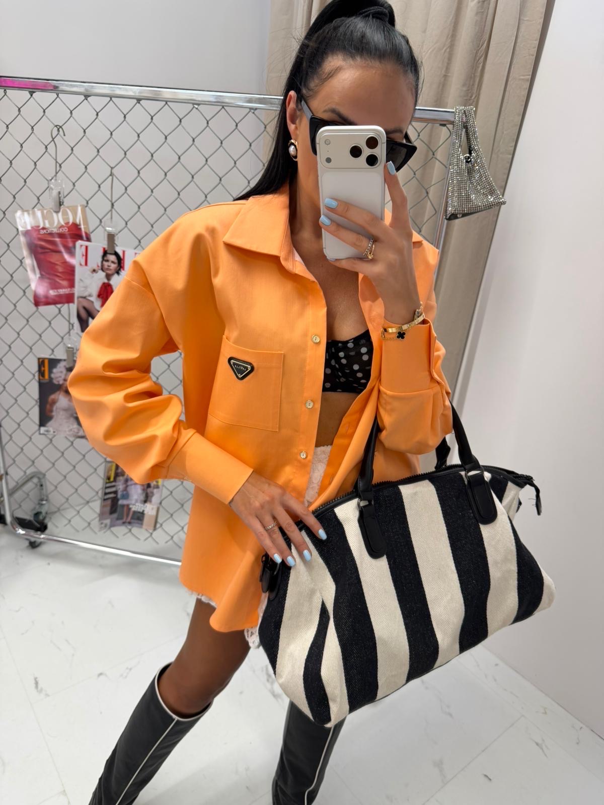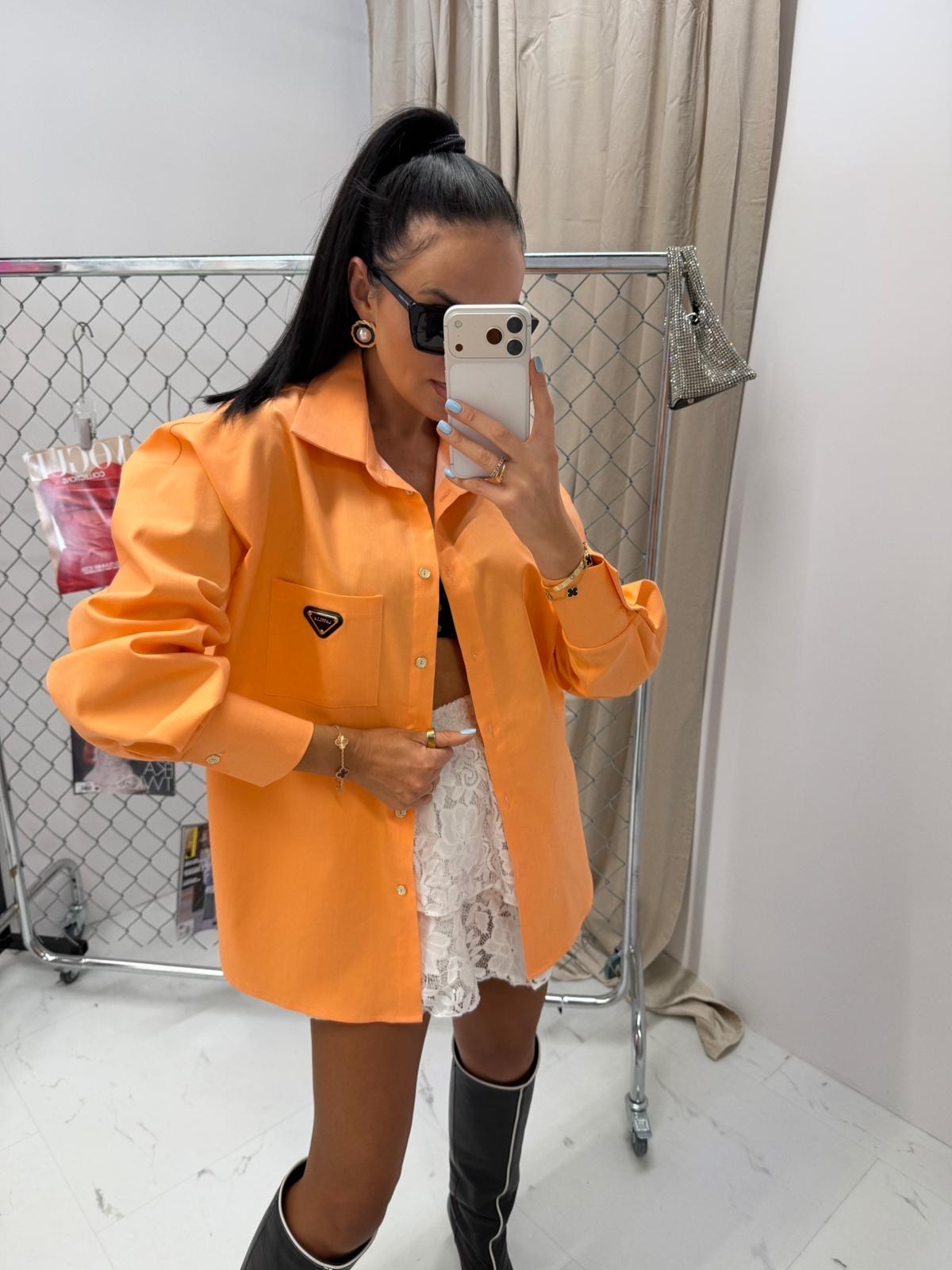 Ta energetyczna koszula oversize z wysokiej jakości przewiewnej bawełny to idealna baza odważnych miejskich stylizacji. Intensywny pomarańczowy odcień zestawiono z klasycznym kołnierzykiem oraz długimi rękawami z szerokimi mankietami, co nadaje całości nowoczesnego wyrazu. Praktyczna kieszeń z subtelnym czarnym trójkątem stanowi intrygujący detal, a dopasowane kolorystycznie guziki pozwalają nosić model klasycznie lub jako luźną narzutkę.