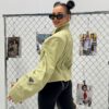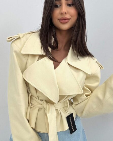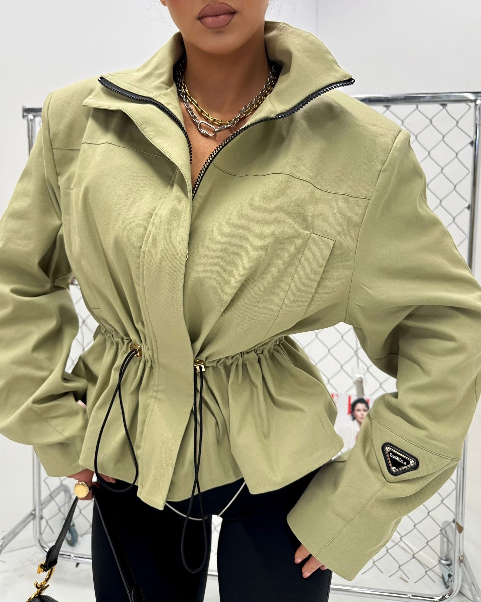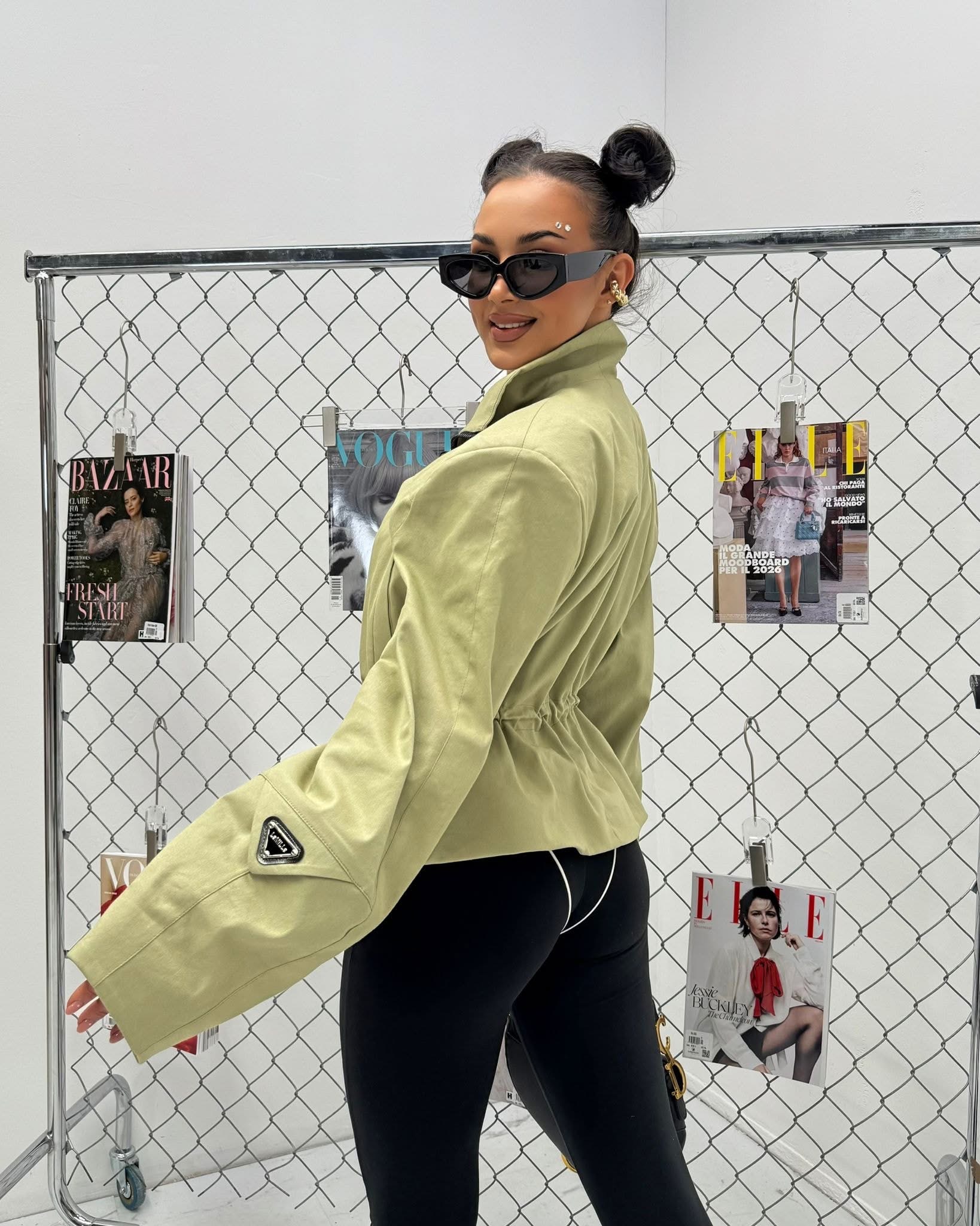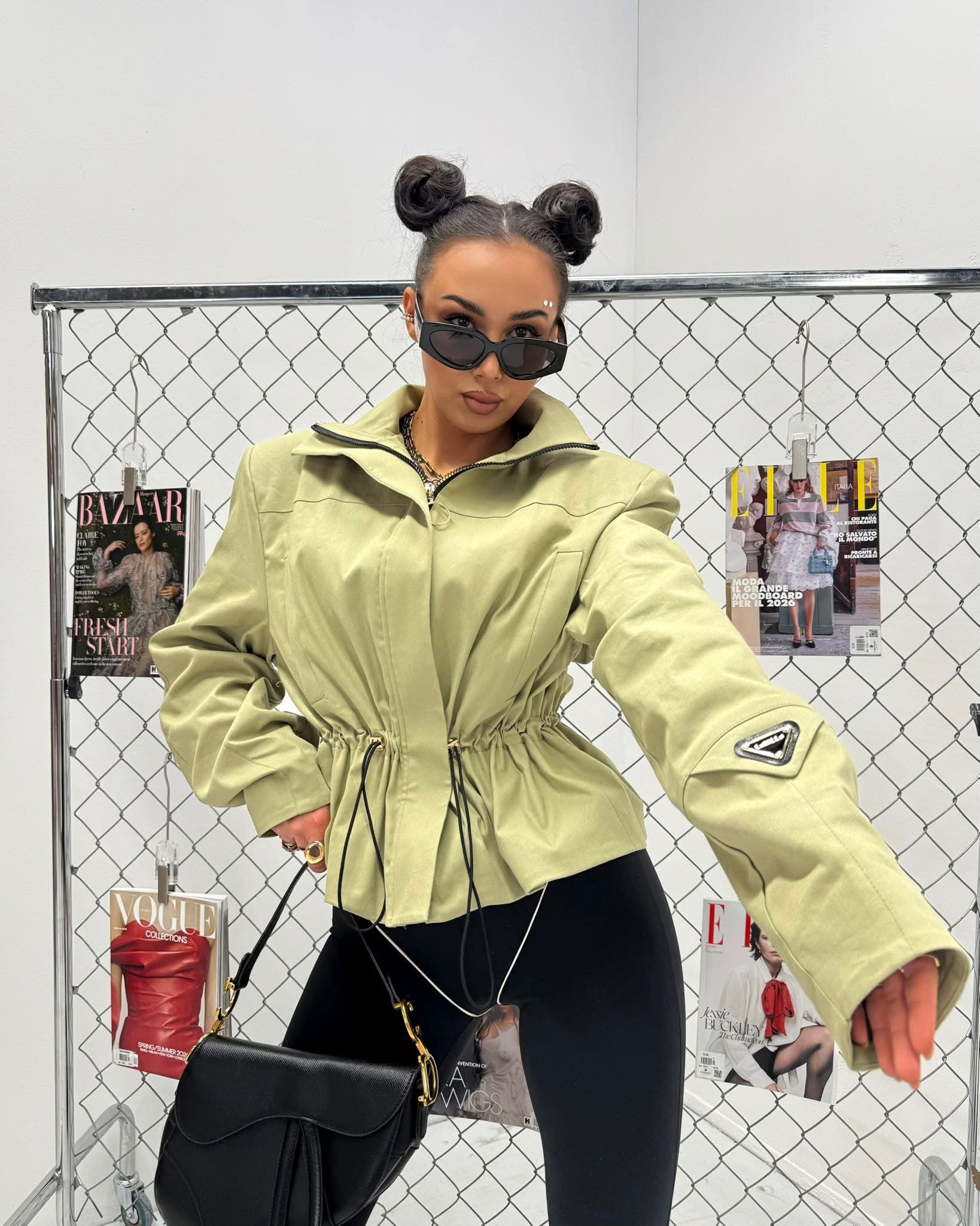 Stylowa kurtka w odcieniu stonowanej oliwki, która łączy elegancję z nowoczesnym designem. Model wyróżnia się mocno zaznaczoną talią z regulowanym ściągaczem, który tworzy efektowną baskinkę i pięknie modeluje sylwetkę. Posiada wysoki kołnierz, zapięcie na zamek oraz ozdobny detal na rękawie. Wykonana z komfortowej tkaniny z przewagą bawełny i wiskozy, idealnie sprawdzi się jako dopełnienie codziennych i bardziej wyjściowych stylizacji.