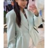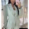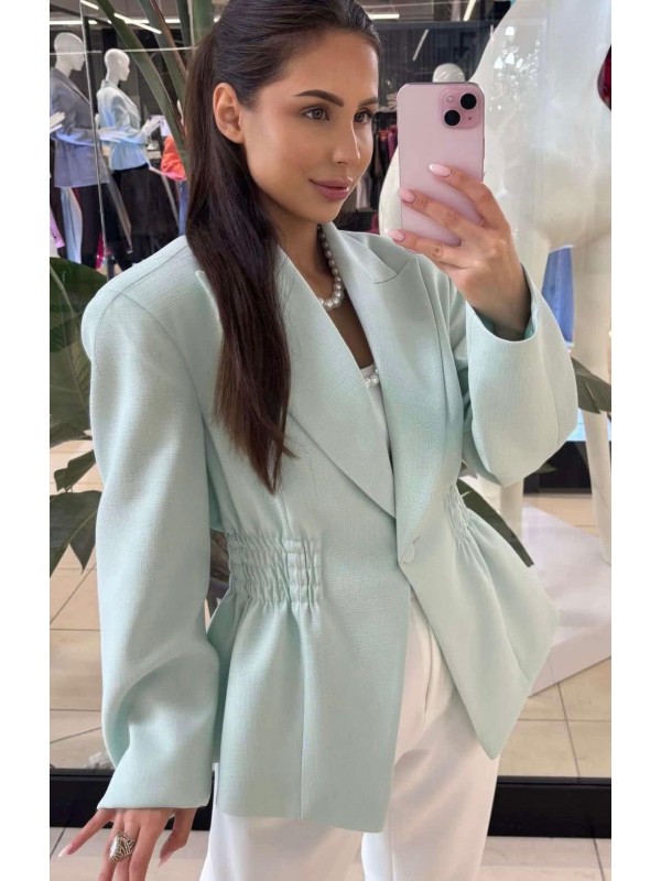 Marynarka o klasycznej długości to bardzo elegancki wybór, który dzięki ściągaczowi w pasie świetnie dopasowuje się do każdej figury. Ma wszyte poduszki na ramionach i wygodne zapięcie na guziczek.